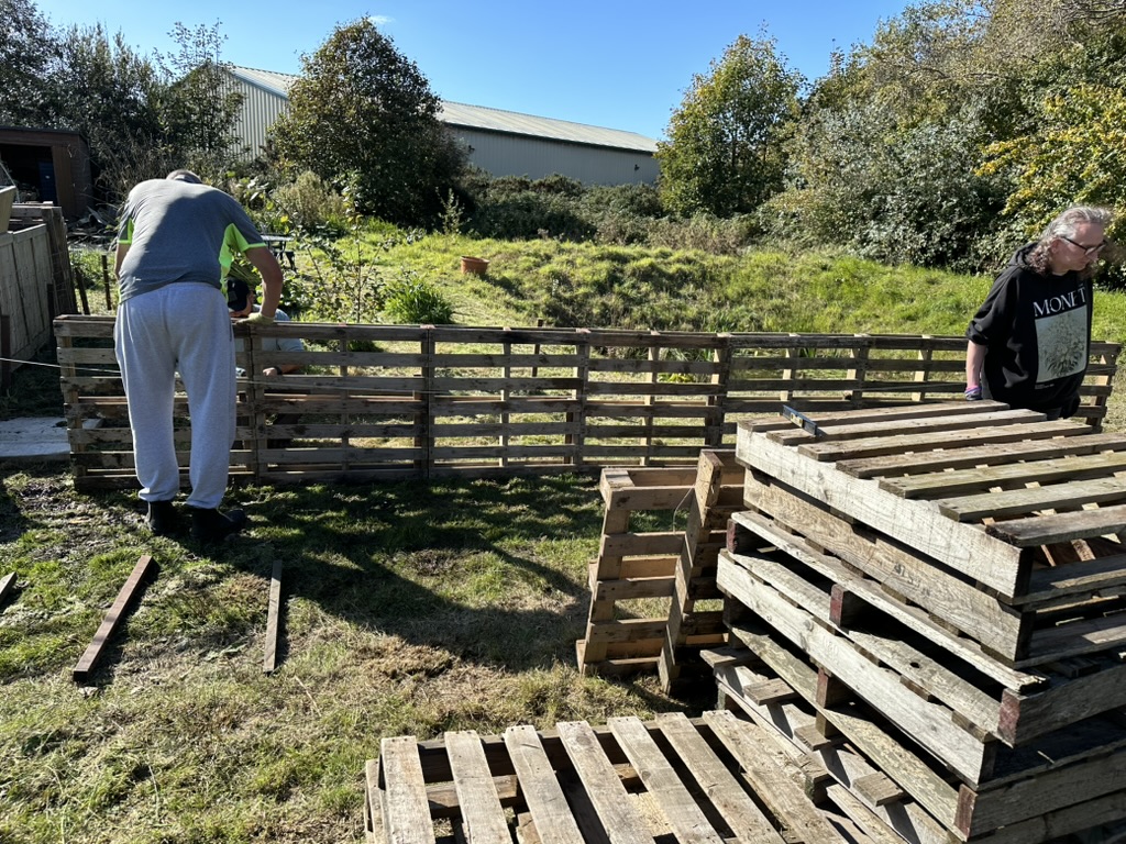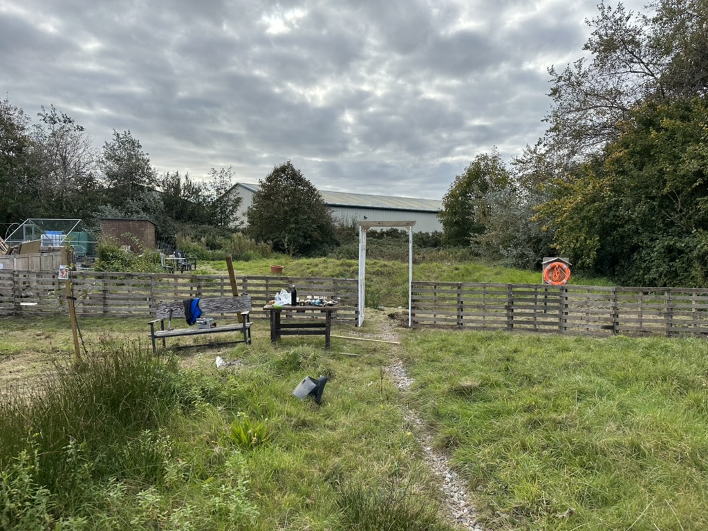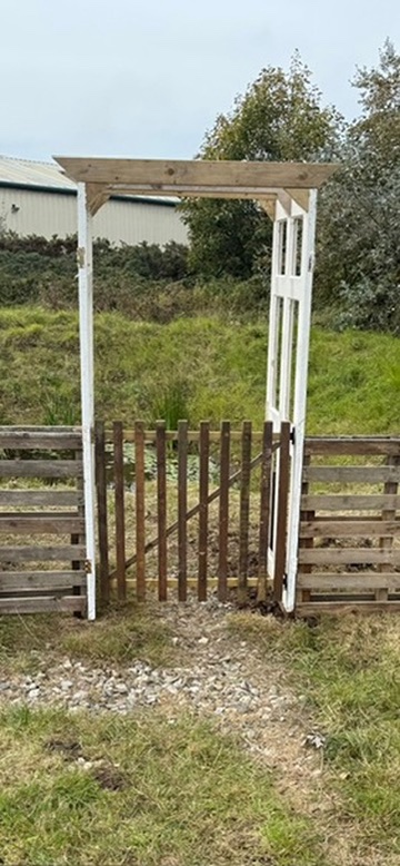 Recently we’ve focused on making the area both safe and welcoming. We’ve added fencing made from recycled pallets along the front, giving it a rustic, eco-friendly look, and chicken wire down the side to mark the boundary. A homemade gate and an archway built from old doors now frame the entrance — the perfect mix of practical and characterful.